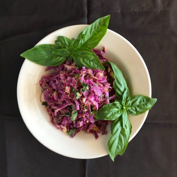 By Josh and Brent of Beekman 1802With ginger honey, horseradish and apple cider vinegar joining in the shredded red cabbage party, this quick-prep side dish packs serious flavor along with what might just be the cure for the common cold.And it must be said that Beekman 1802 has so many amazing recipes, it was truly hard to pick just one. This one won for color, audacious ingredients and exceedingly easy prep.Ingredients: Shredded cabbage-1 lb red cabbage, coarsely shredded (approx 5 cups)-2 cups coarsely chopped basil-1/3 cup finely diced cubano pepperFor Dressing-2 tablespoons sesame seeds-2 teaspoons sesame oil-1/3 cup peanut butter-5 tablespoons apple cider vinegar-1 tablespoon ginger honey-2 teaspoons fresh grated ginger-3 tablespoon soy sauce-1 teaspoon grated horseradish-1/4 cup white wineVisit Beekman 1802 for full recipe instructions